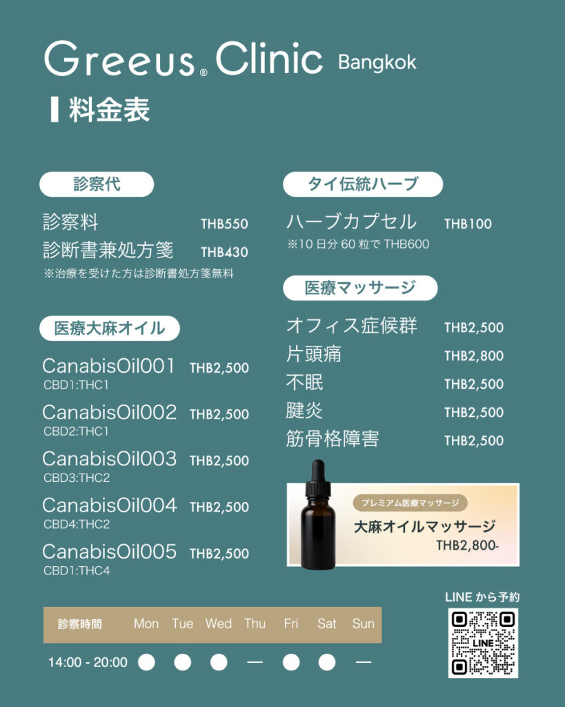 タイは世界でも最新の医療大麻法が許可されたマーケットの一つです。Greeus® Clinic Bangkokは、高質で安定した医療大麻製品を提供すると同時に、日本人も安心して診療を受けられる環境を整えています。