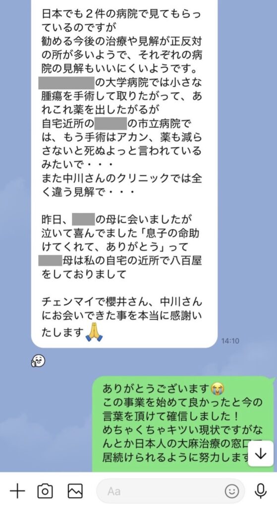 一方で、別の患者さんは「医療大麻を使ってみたかった」と最後に言い残し、この世を去った方もいます。