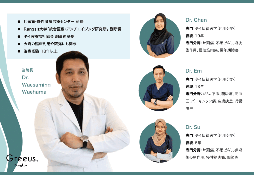 少しずつ医師との信頼を築き上げ、ついにランシット大学統合医療研究所・副所長であり、医療大麻研究をリードするDr. Waesaming Waehamaが、Greeus® Clinic Bangkokの院長を務めてくださることになりました。